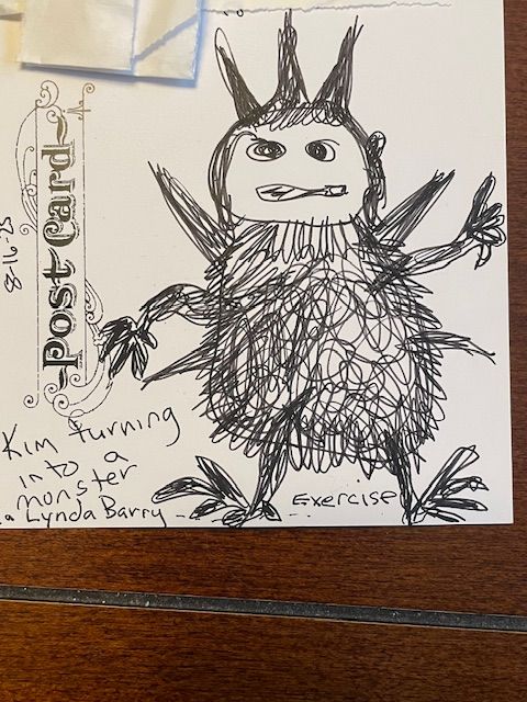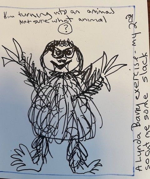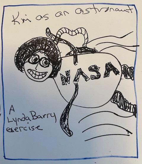 Yesterday in my local library (still love the library!) I came across Lynda Barry’s book Making Comics, which is a book about not being afraid to draw even if you can’t draw. Yep—that’s me, and I was looking for some inspiration to start doing something creative, so I brought it home. And this morning, while the husband was out running an errand, i stuck my toe in the water by completing her first exercise/class assignment: 4 self-portraits in 12 minutes, following a specific prompt. Here are the results: